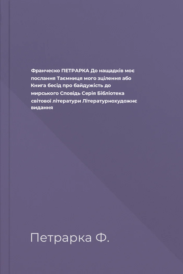 Загалом, "До нащадків моє послання: Таємниця мого зцілення або Книга бесід про байдужість до мирського Сповідь" Франческо Петрарки — це книга, яка має бути у книжковій шафі кожного, хто віддає перевагу глибокому змісту та душевній мудрості. Вона не лише навчить вас багатьох речей, але й стане провідником у світі власних роздумів та відкриттів.